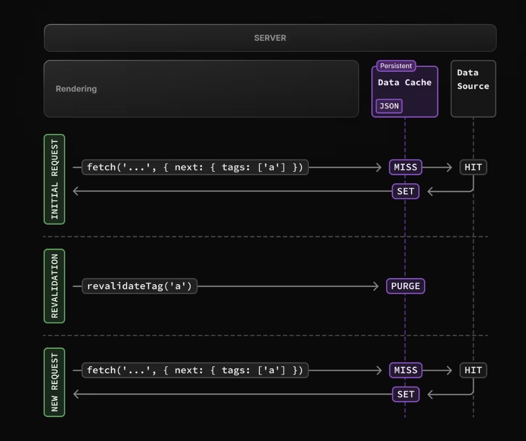 - Next.js에는 들어오는 서버 요청과 배포에서 데이터 페치 결과를 유지하는 내장형 데이터 캐시가 있다.